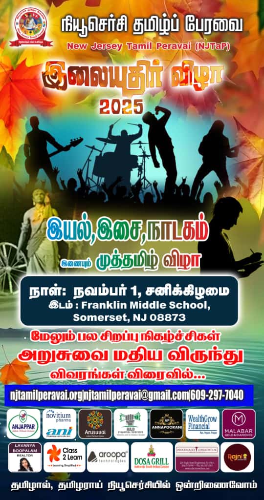 நியூசெர்சி தமிழ்ப் பேரவையின் இலையுதிர் விழா 2025 இயல், இசை, நாடகம் இணையும் முத்தமிழ் விழா!! சதுரங்கப் போட்டி, ஓவியப் போட்டி, திரையிசை நடனம்,…