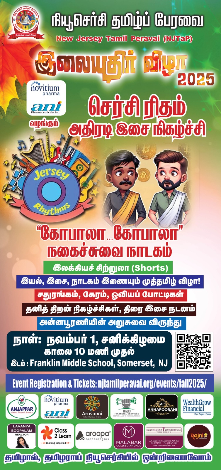 நியூசெர்சி தமிழ்ப் பேரவையின் இலையுதிர் விழா 2025 செர்சி ரிதம் குழுவினரின் அதிரடி இசை நிகழ்ச்சி. “கோபாலா…கோபாலா” நகைச்சுவை நாடகம். இயல், இசை, நாடகம் இணையும்…